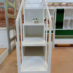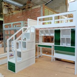 Spesifikasi 1 bed, 1 meja belajar, 1 lemari, tangga rak & laci