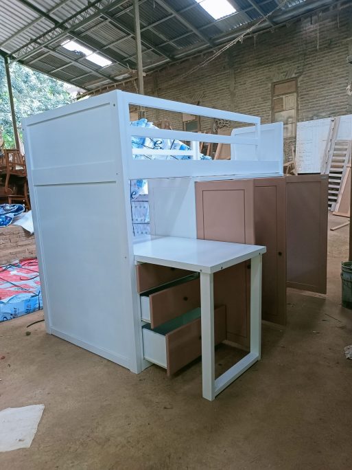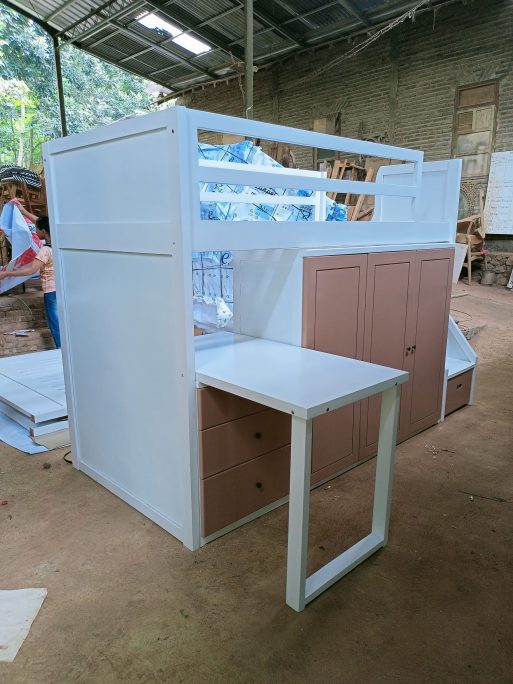 Spesifikasi 1 bed, meja belajar, laci, lemari, tangga laci samping